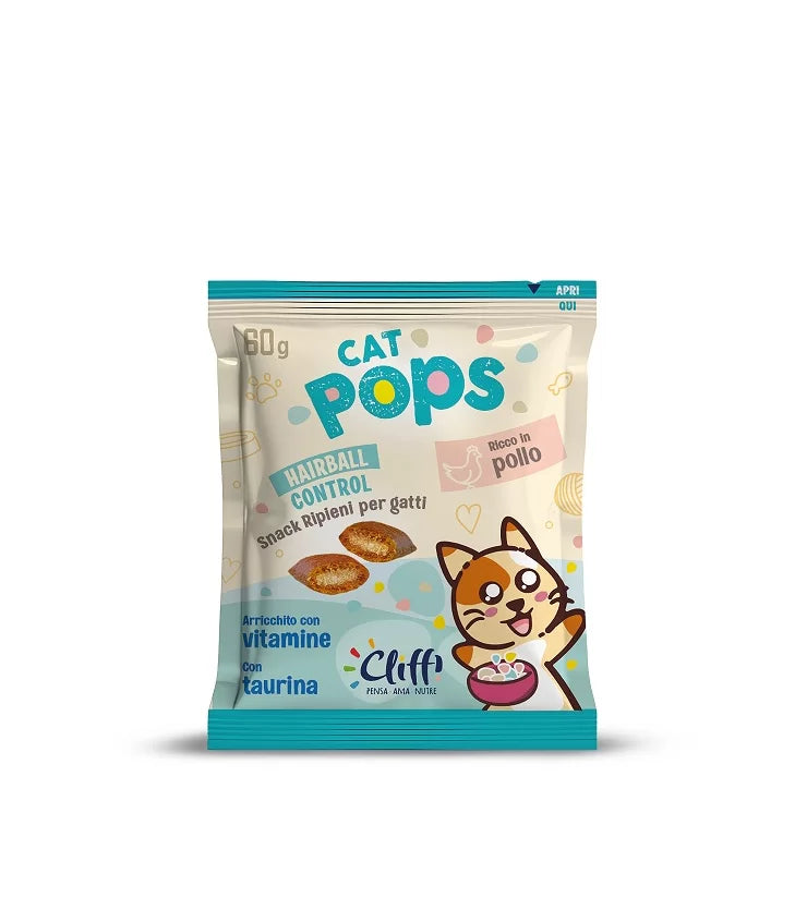 CLIFFI CAT POPS – HAIRBALL CONTROL sono premietti per gatti, croccanti fuori e morbidi dentro, altamente appetibili. La formula Hairball control è realizzata con ingredienti utili alla naturale espulsione dei boli di pelo, come fibre vegetali e malto. Nella sua preparazione non vengono aggiunti coloranti, conservanti e aromi artificiali. È la ricompensa ideale tra i pasti. Confezionato in atmosfera protettiva.