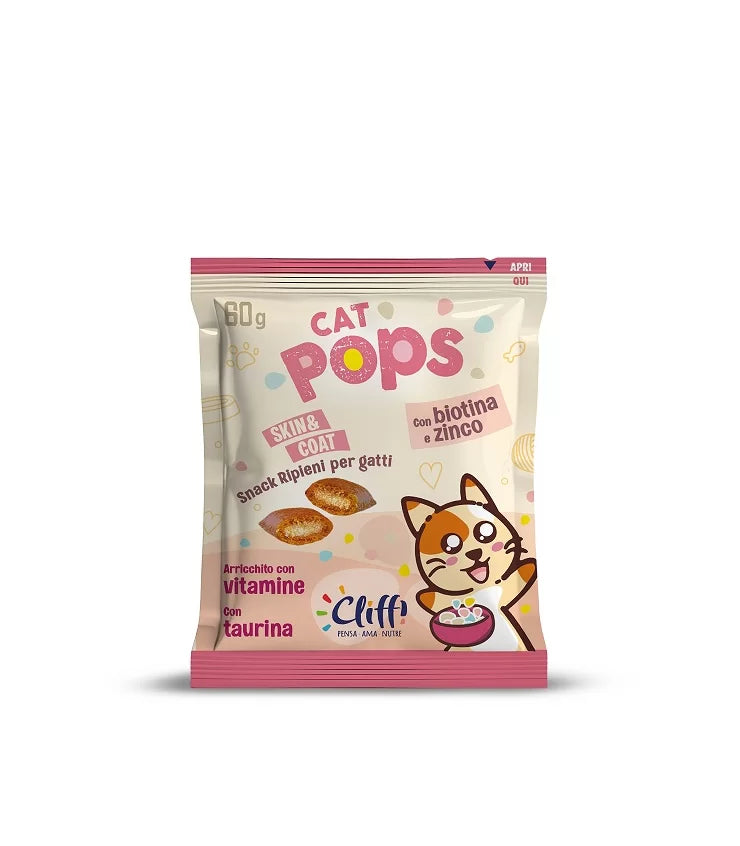 CLIFFI CAT POPS – SKIN & COAT sono premietti croccanti fuori e morbidi dentro, altamente appetibili. La formula Skin & coat è realizzata con ingredienti funzionali utili al mantenimento della barriera cutanea e della bellezza del manto, come krill, biotina e zinco. Nella sua preparazione non vengono aggiunti conservanti e aromi artificiali. È la ricompensa ideale tra i pasti. Confezionato in atmosfera protettiva.
