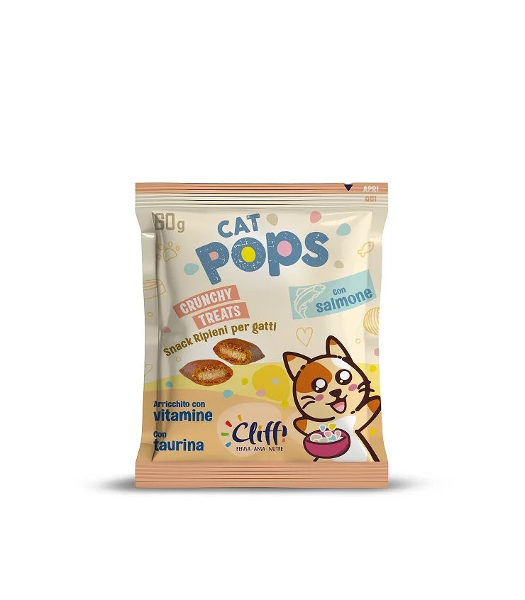 CLIFFI CAT POPS – SALMONE sono premietti croccanti fuori e morbidi dentro, altamente appetibili, con salmone. Nella loro preparazione non vengono aggiunti conservanti e aromi artificiali. È la ricompensa ideale tra i pasti. Confezionato in atmosfera protettiva.